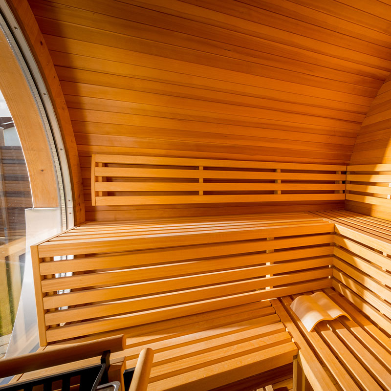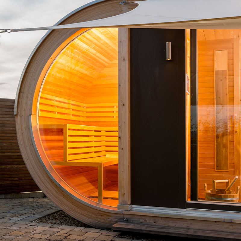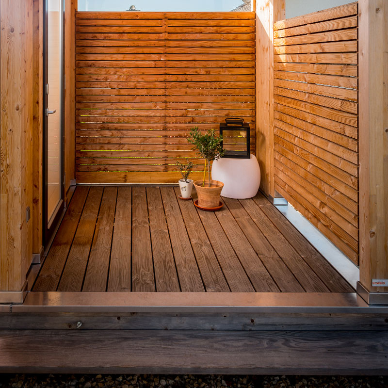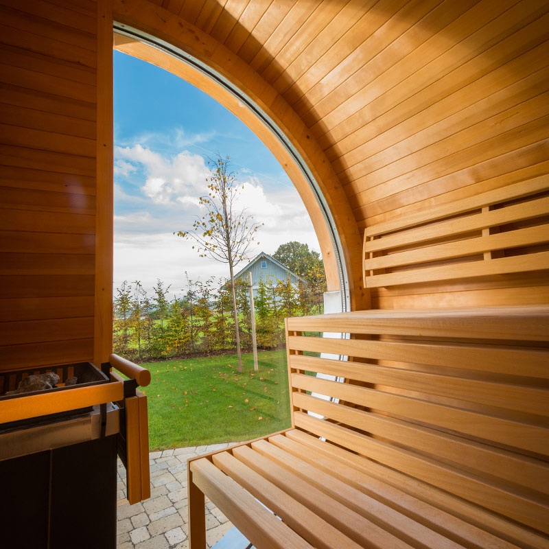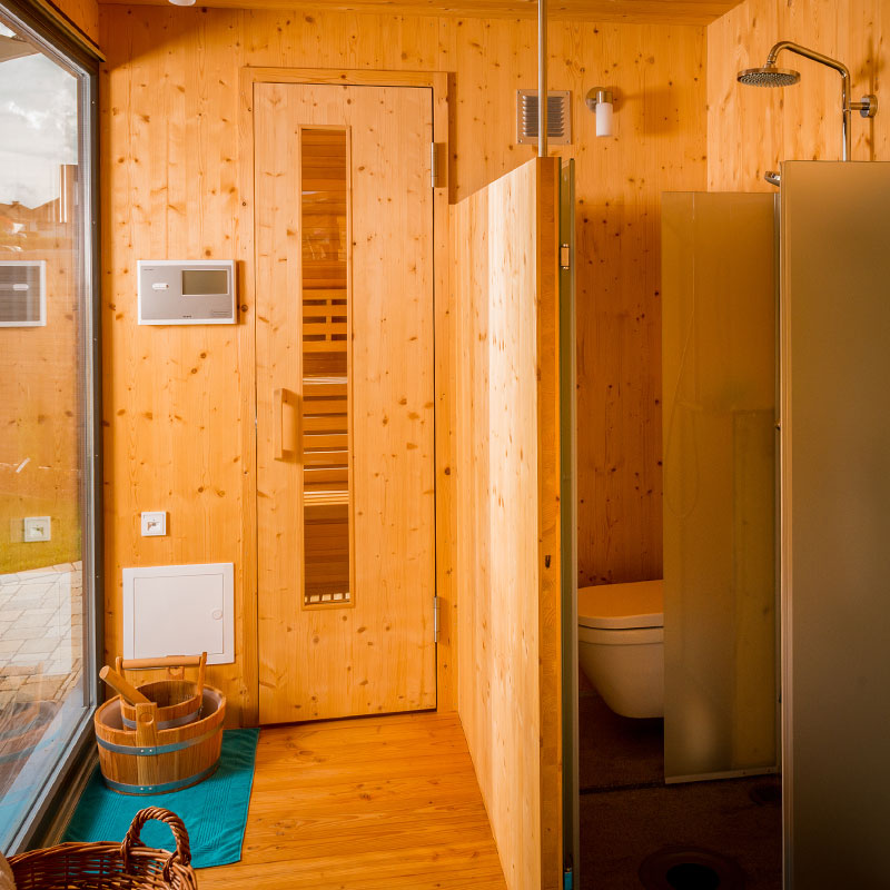 Passend zur Gartenarchitektur haben wir ein maßgeschneidertes Design-Gartenhaus mit luxuriöser Wellness-Ausstattung gefertigt. Als Grundentwurf diente das Ettwein Gartenhaus „pico“ – hier kam es mit 2,5 m x 7,5 m zur Ausführung, wobei davon 2,2 m als überdachte Pergola erstellt wurden. Trotz kompakter Abmessungen findet neben dem Ruheraum eine Dusche, ein WC sowie eine maßgeschreinerte Sauna ausreichend Platz. Die Sauna fügt sich ansprechend in die Rundung ein und bietet Platz für bis zu fünf Personen. Wandbekleidungen in Hemlock, variable Sitzbänke aus Ayus, eine regulierbare Entlüftung der Sauna, ein LAN-Anschluss und eine Infrarot-Natursteinheizplatte mit Frostwächterfunktion runden die komfortable Ausstattung ab.