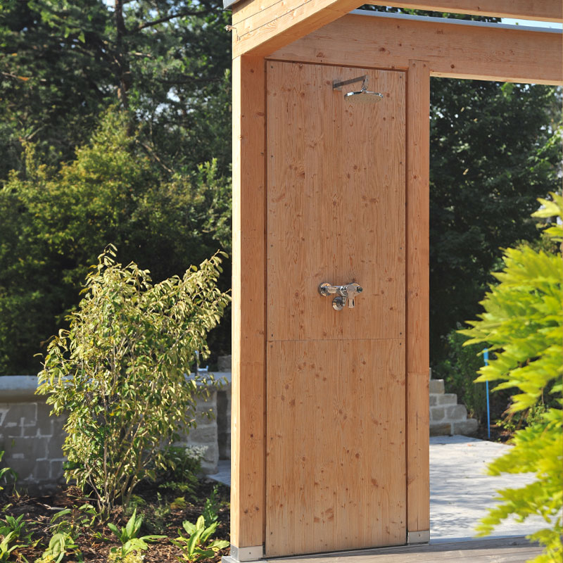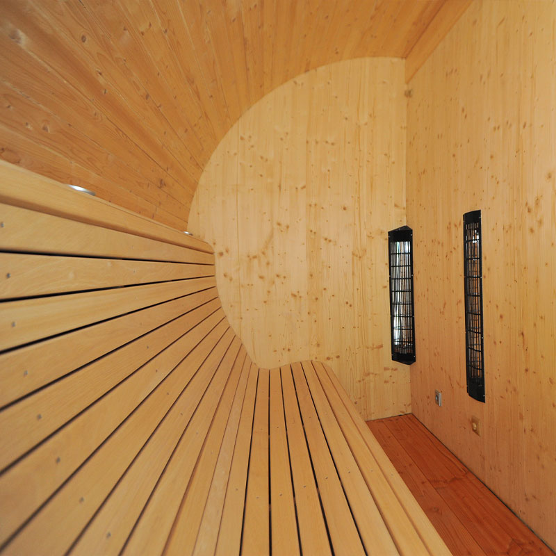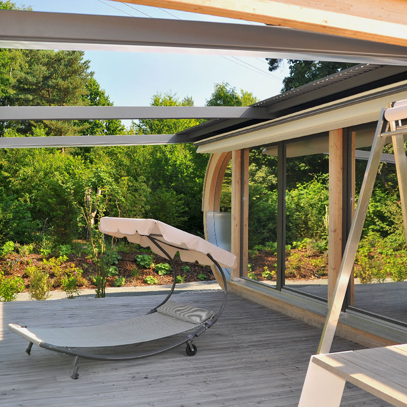 Auf 3,5 m x 11 m Länge (3,2 m davon als offene Pergola) erstreckt sich dieser Wellness-Tempel und bietet exklusiven Raum zum Erholen.