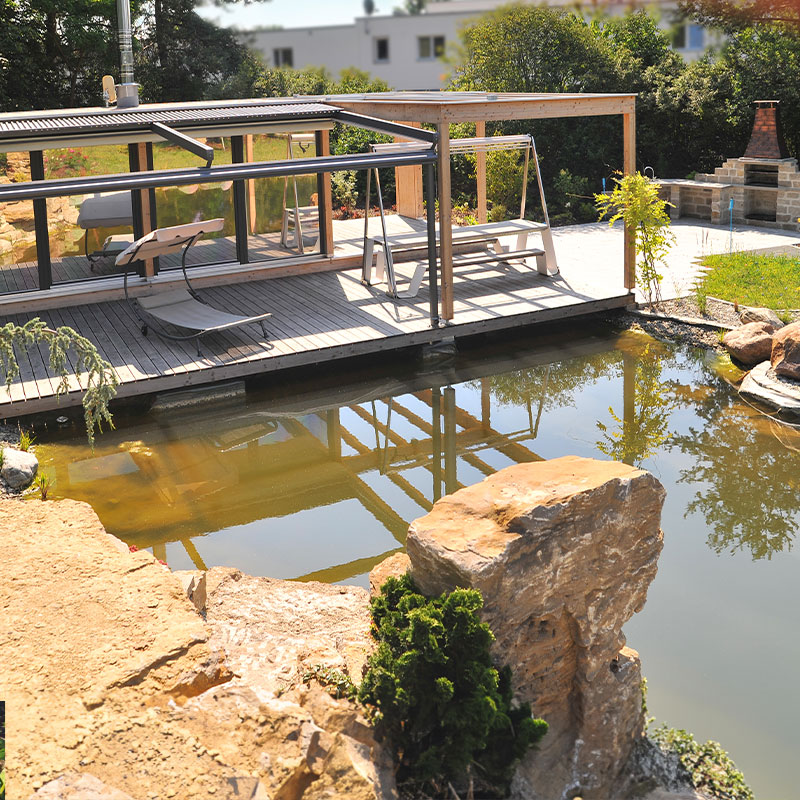 Eingebettet in eine herrliche Gartenanlage mit Schwimmteich inklusive Wasserfällen, bereichert die Gartenlounge mit ihrem außergewöhnlichen Design diesen ohnehin schon traumhaften Garten.