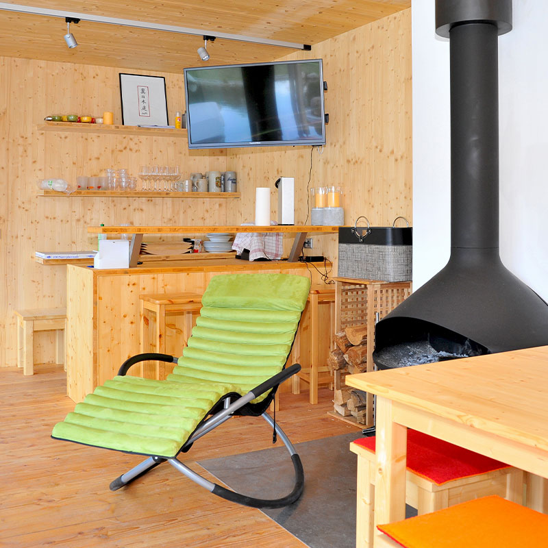 Im Bereich der Massivholzrundung wurde eine speziell zusammengestellte Infrarot-Sauna verbaut. Im Aufenthaltsraum findet sich eine Bar aus Massivholz inkl. Unterputz-Kühlschrank. Alles gefertigt von unseren Ettwein Schreinern. Außen lädt der große Grill zum Gartenfest ein. Die wandintegrierten Lautsprecher können kabellos per Smartphone bedient werden. Auf der Holzterrasse mit Pergola gibt es genügend Platz für Gäste. Bei Bedarf sorgt das automatische Sonnensegel für angenehmen Schatten. Für zusätzliche Erfrischung sorgt die integrierte Außendusche. An kühleren Abenden lässt sich mit dem Holzofen einheizen.