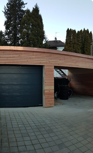 Stylischer Carport aus Holz in Berlin mit zusätzlichem Abstellraum.