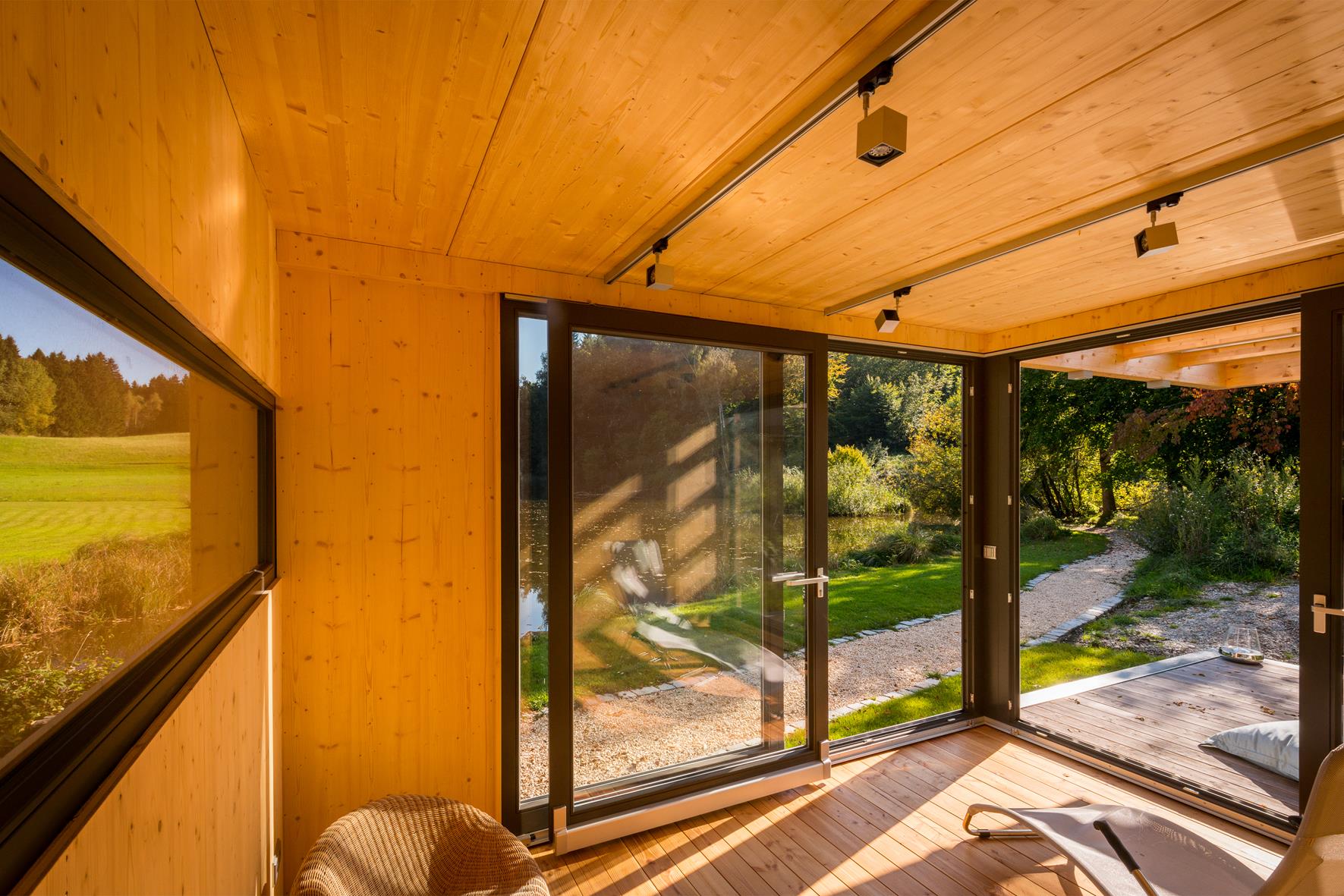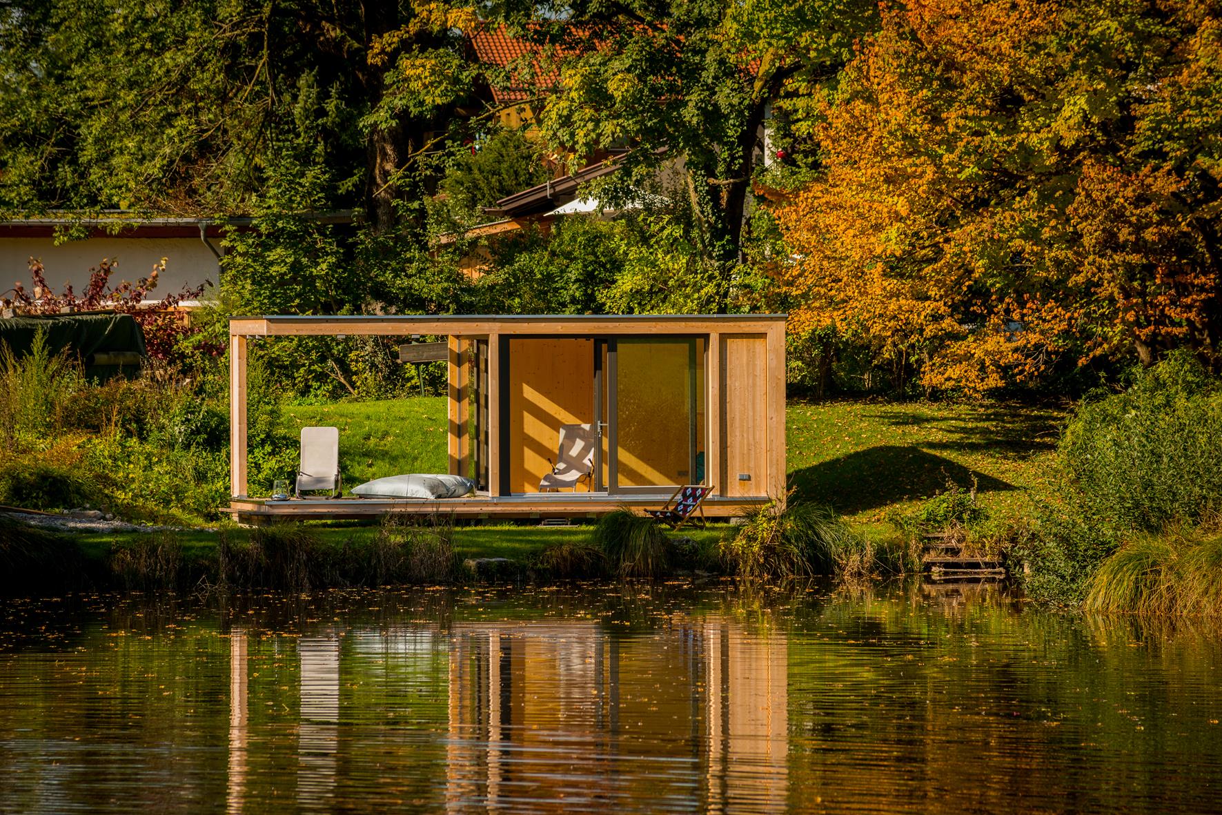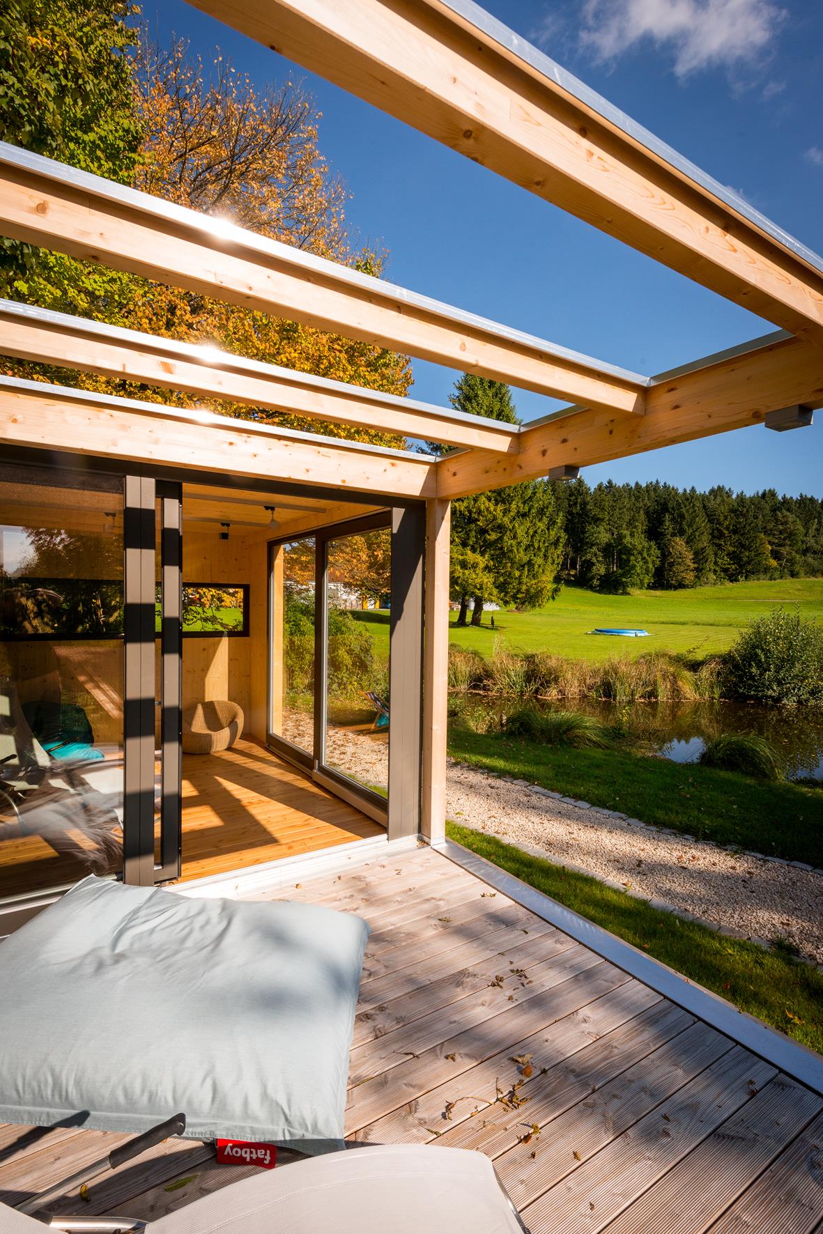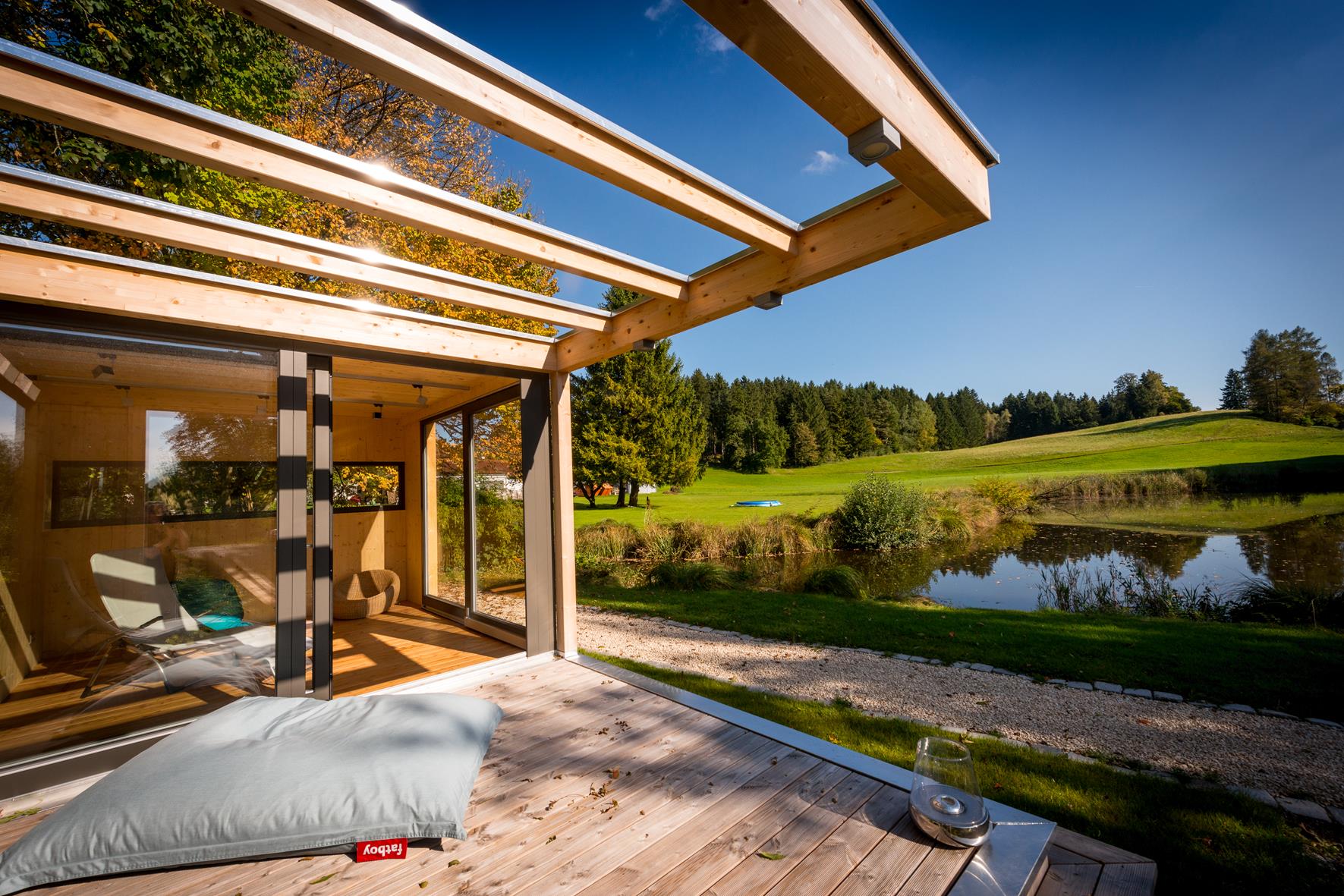 Dieses Gartenhaus wurde im kubischen "2.0-Design" mit den Grundabmessungen 3,5m x 7,5m erstellt. Als Teilbereich wurden davon 3m als offene Pergola ausgeführt - besonders gut kommt in diesem Bereich das freitragende Eckdetail zur geltung, welches ohne Stütze konstruiert werden konnte. In der Stirnseite wurde ein zusätzliches Lichband erstellt. Der Innenbereich ershließt sich zur Pergola hin über eine doppelte Schiebtüre. So ist jederzeit der Blick auf den idyllischen See frei - Urlaubsatmosphäre zu Hause!