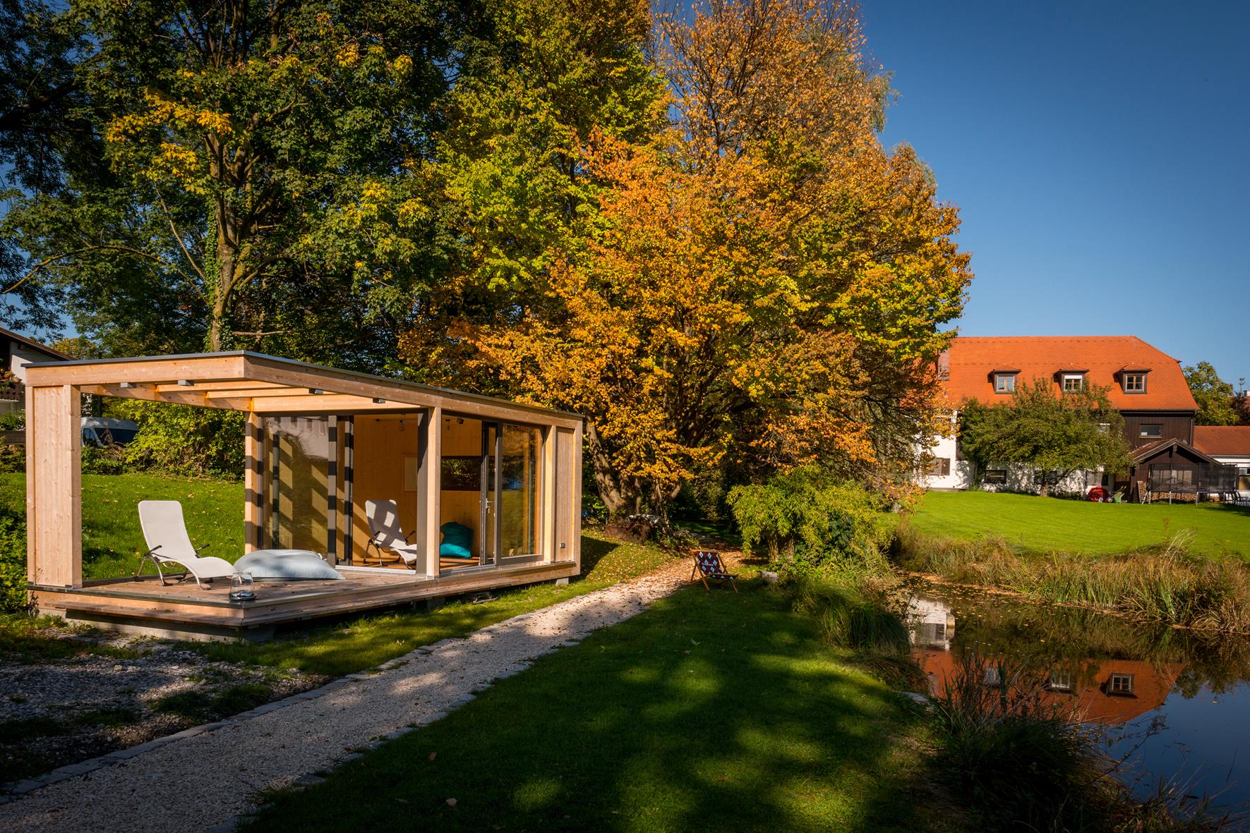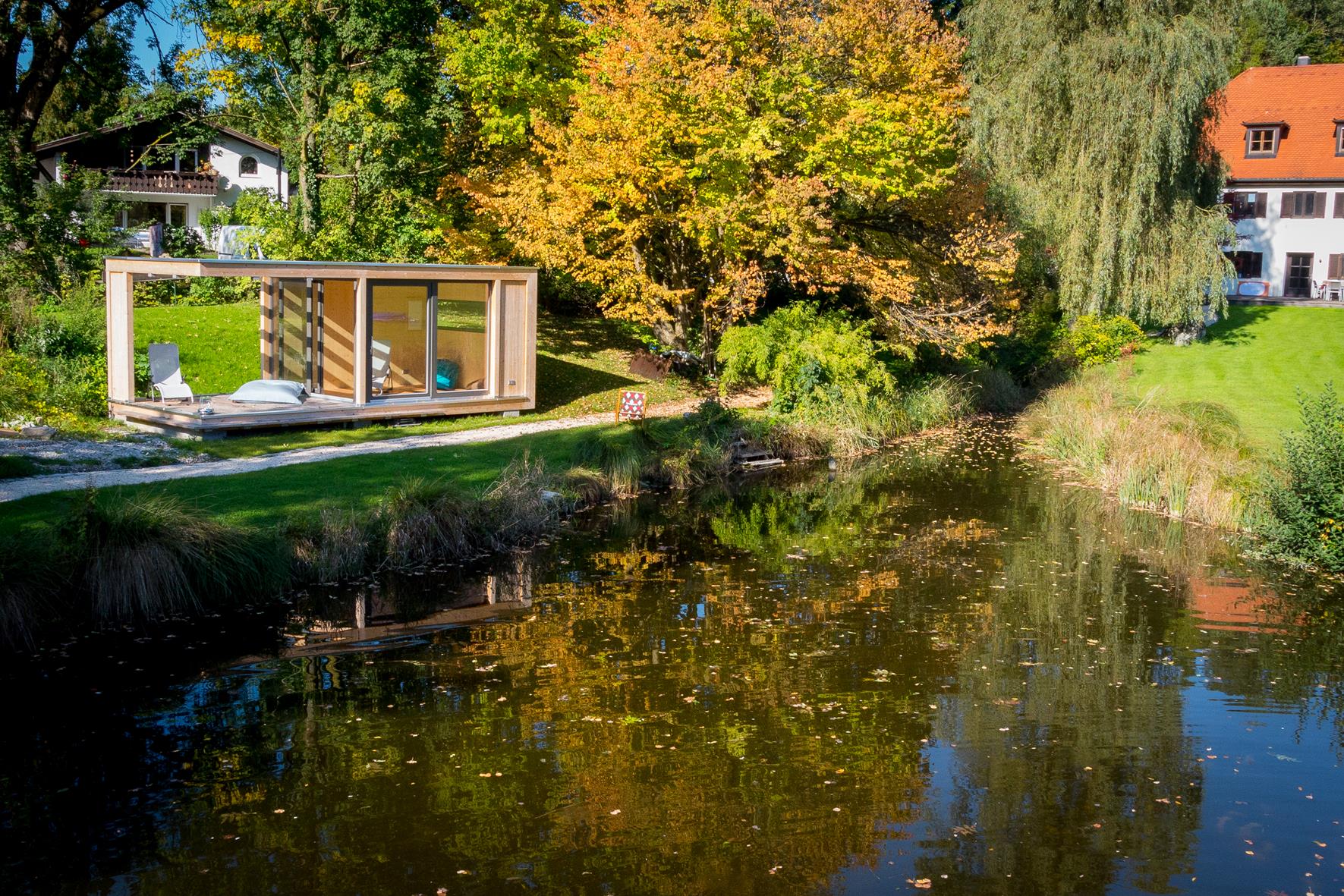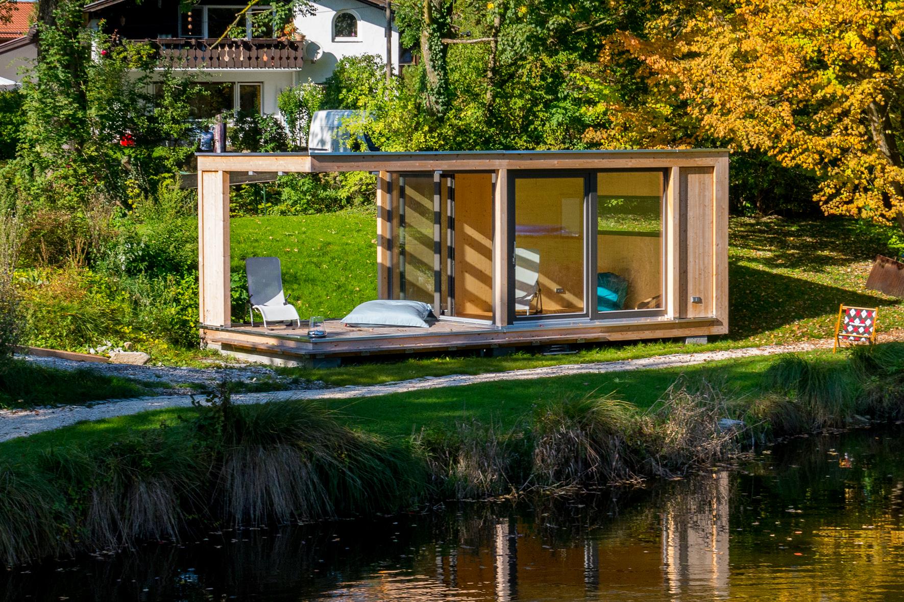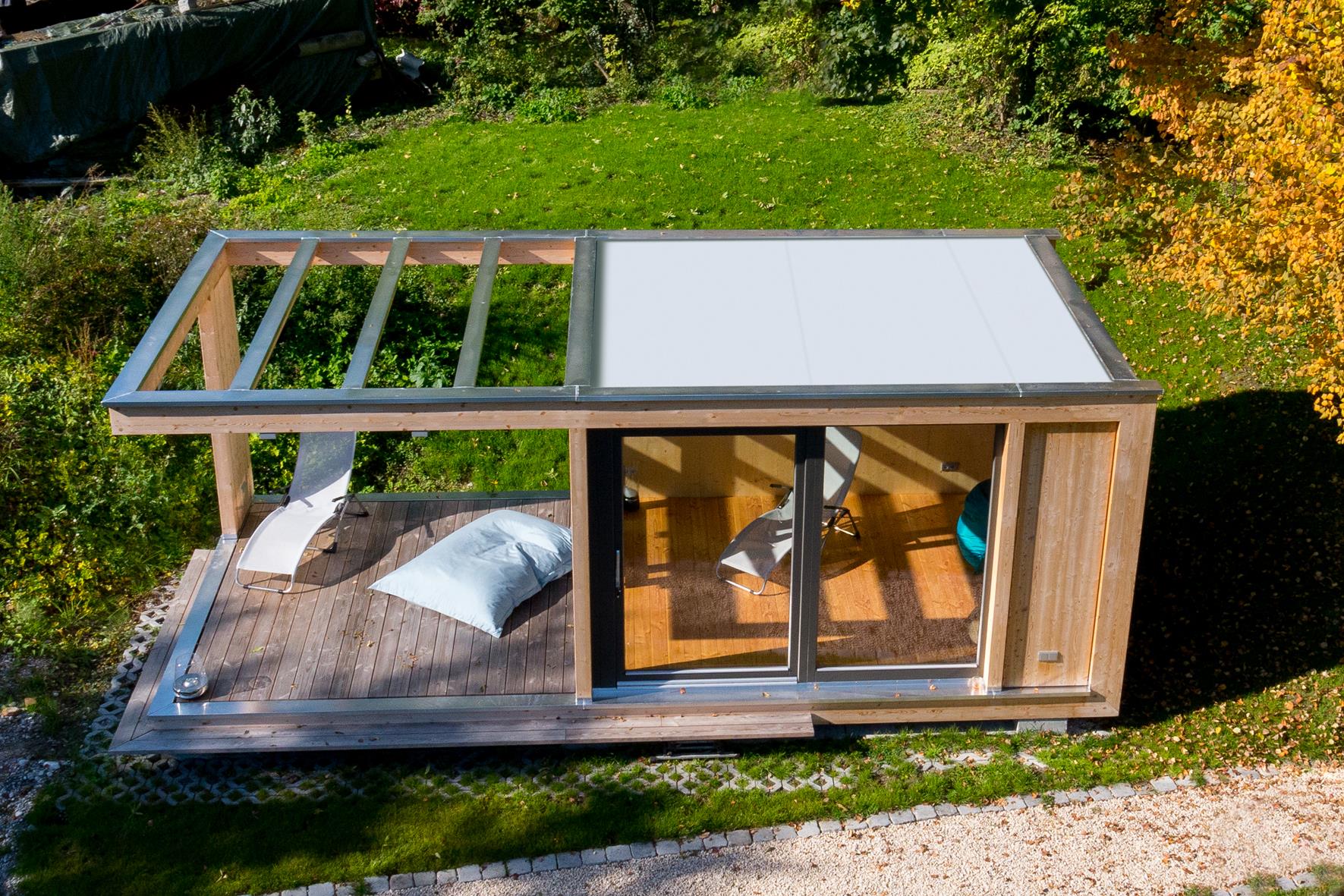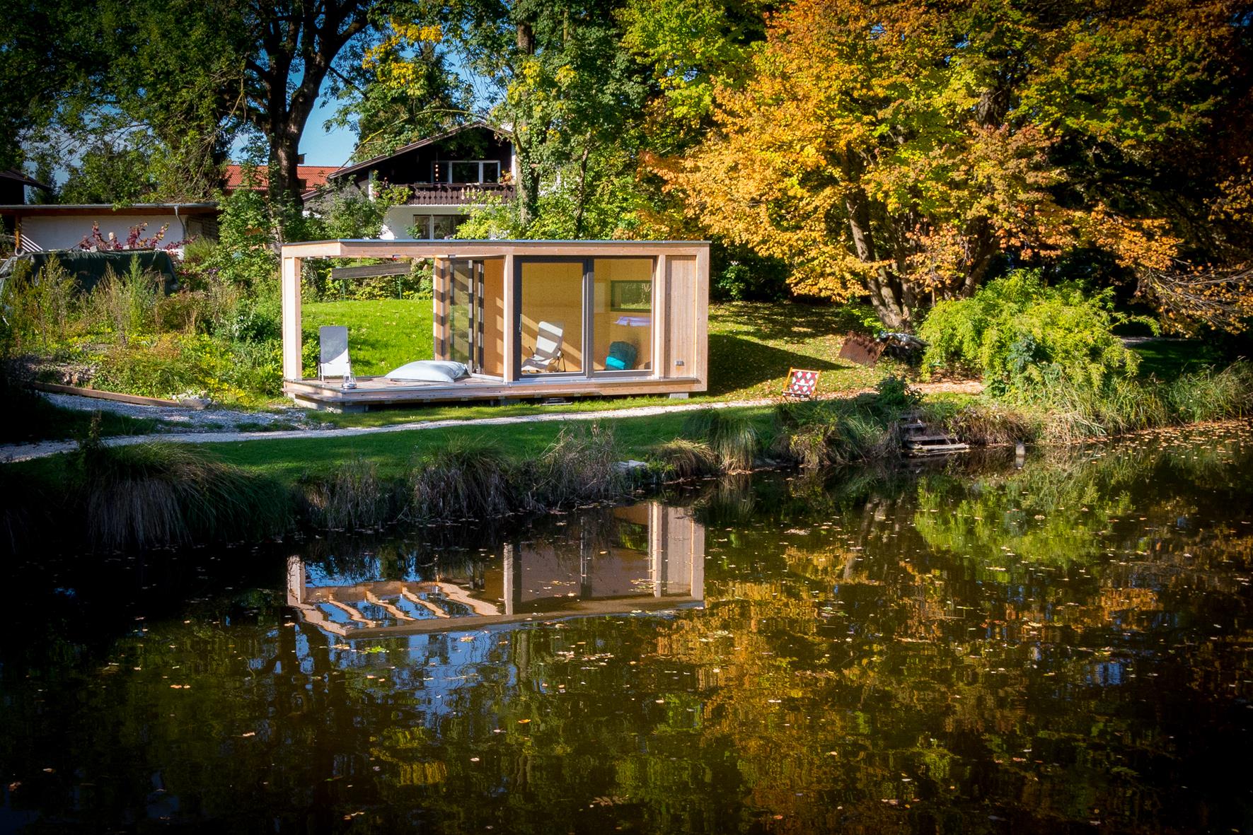 Dieses Gartenhaus wurde im kubischen "2.0-Design" mit den Grundabmessungen 3,5m x 7,5m erstellt. Als Teilbereich wurden davon 3m als offene Pergola ausgeführt - besonders gut kommt in diesem Bereich das freitragende Eckdetail zur geltung, welches ohne Stütze konstruiert werden konnte. In der Stirnseite wurde ein zusätzliches Lichband erstellt. Der Innenbereich ershließt sich zur Pergola hin über eine doppelte Schiebtüre. So ist jederzeit der Blick auf den idyllischen See frei - Urlaubsatmosphäre zu Hause!