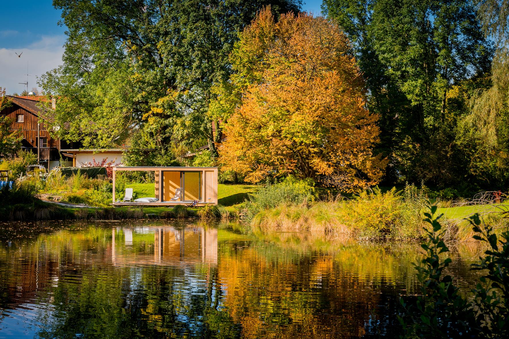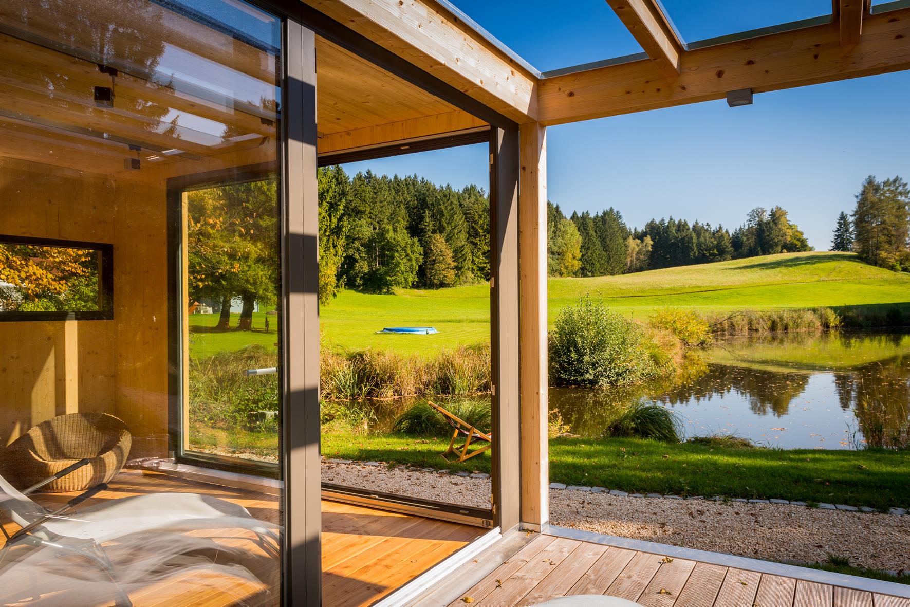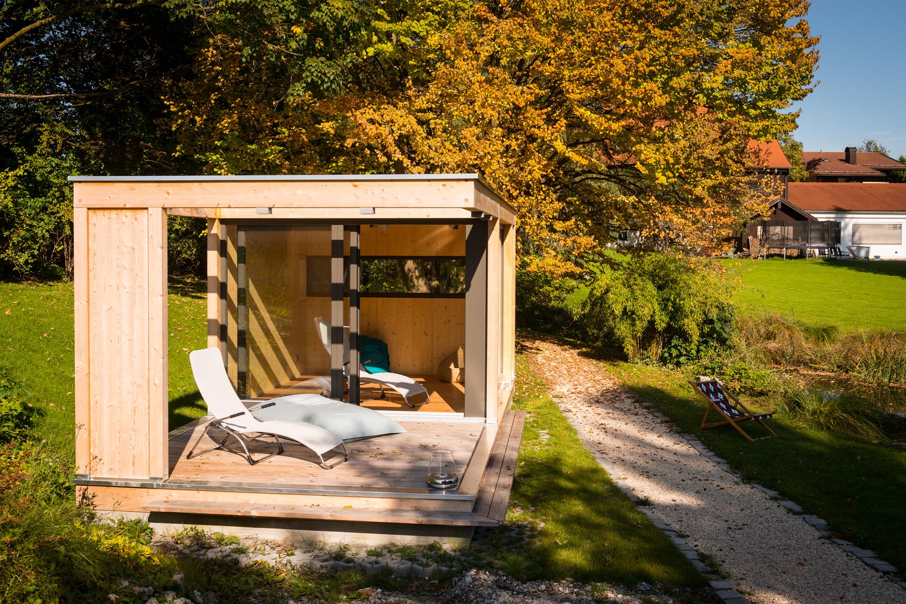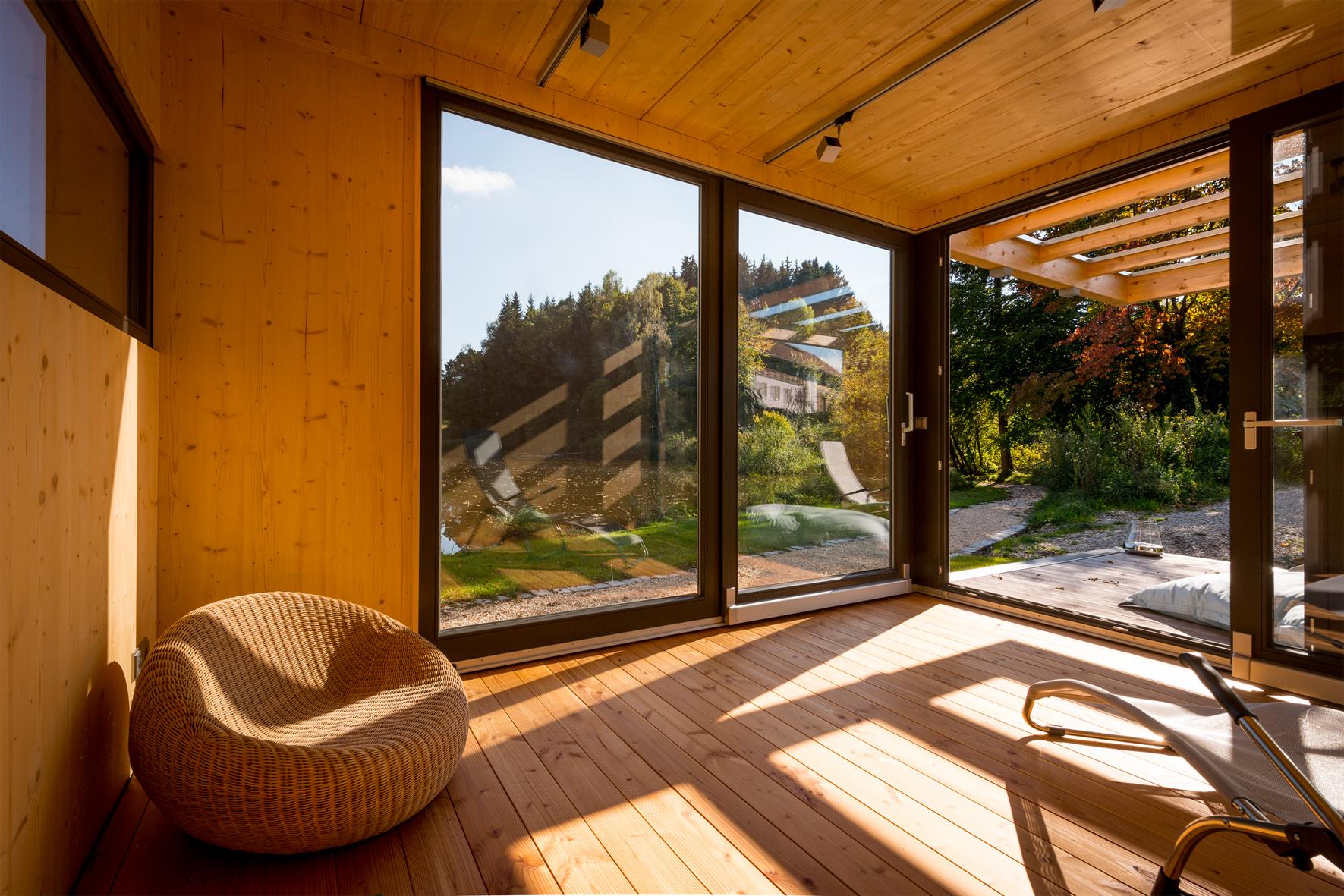 Dieses Gartenhaus wurde im kubischen "2.0-Design" mit den Grundabmessungen 3,5m x 7,5m erstellt. Als Teilbereich wurden davon 3m als offene Pergola ausgeführt - besonders gut kommt in diesem Bereich das freitragende Eckdetail zur geltung, welches ohne Stütze konstruiert werden konnte. In der Stirnseite wurde ein zusätzliches Lichband erstellt. Der Innenbereich ershließt sich zur Pergola hin über eine doppelte Schiebtüre. So ist jederzeit der Blick auf den idyllischen See frei - Urlaubsatmosphäre zu Hause!