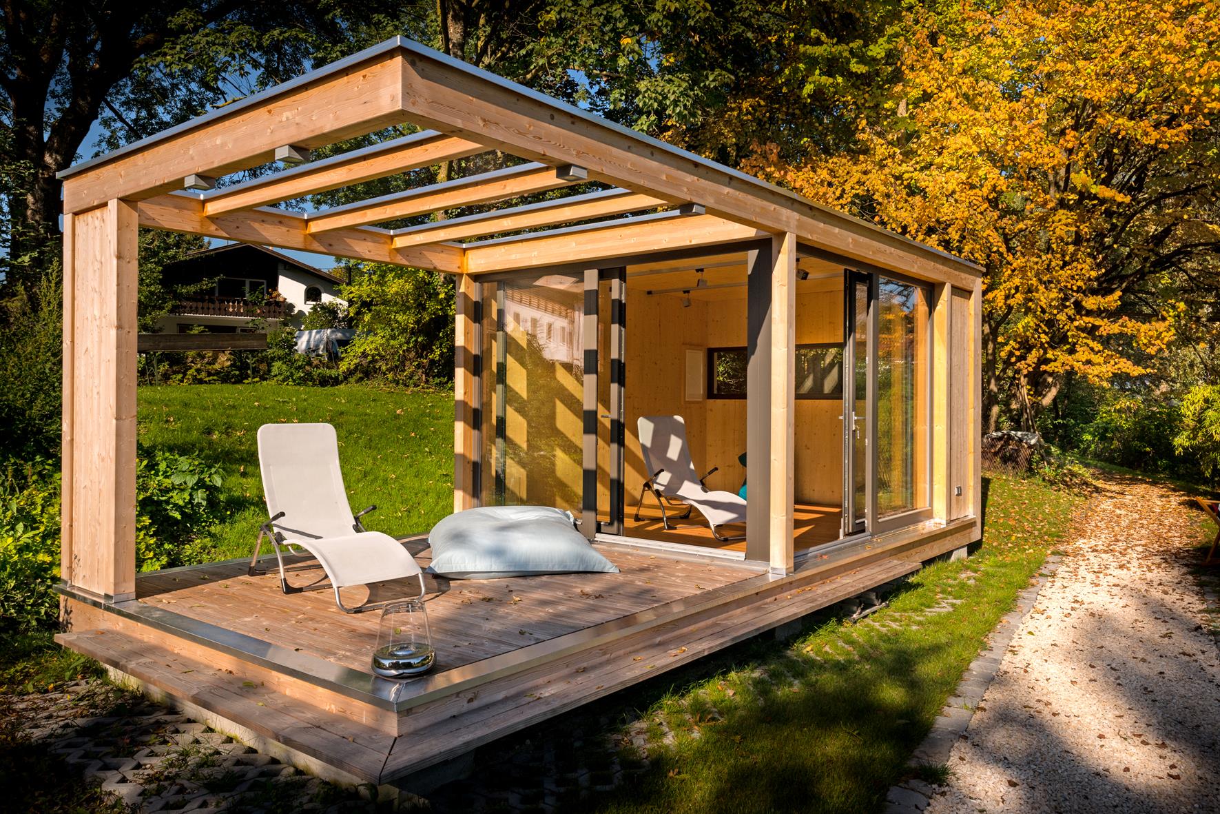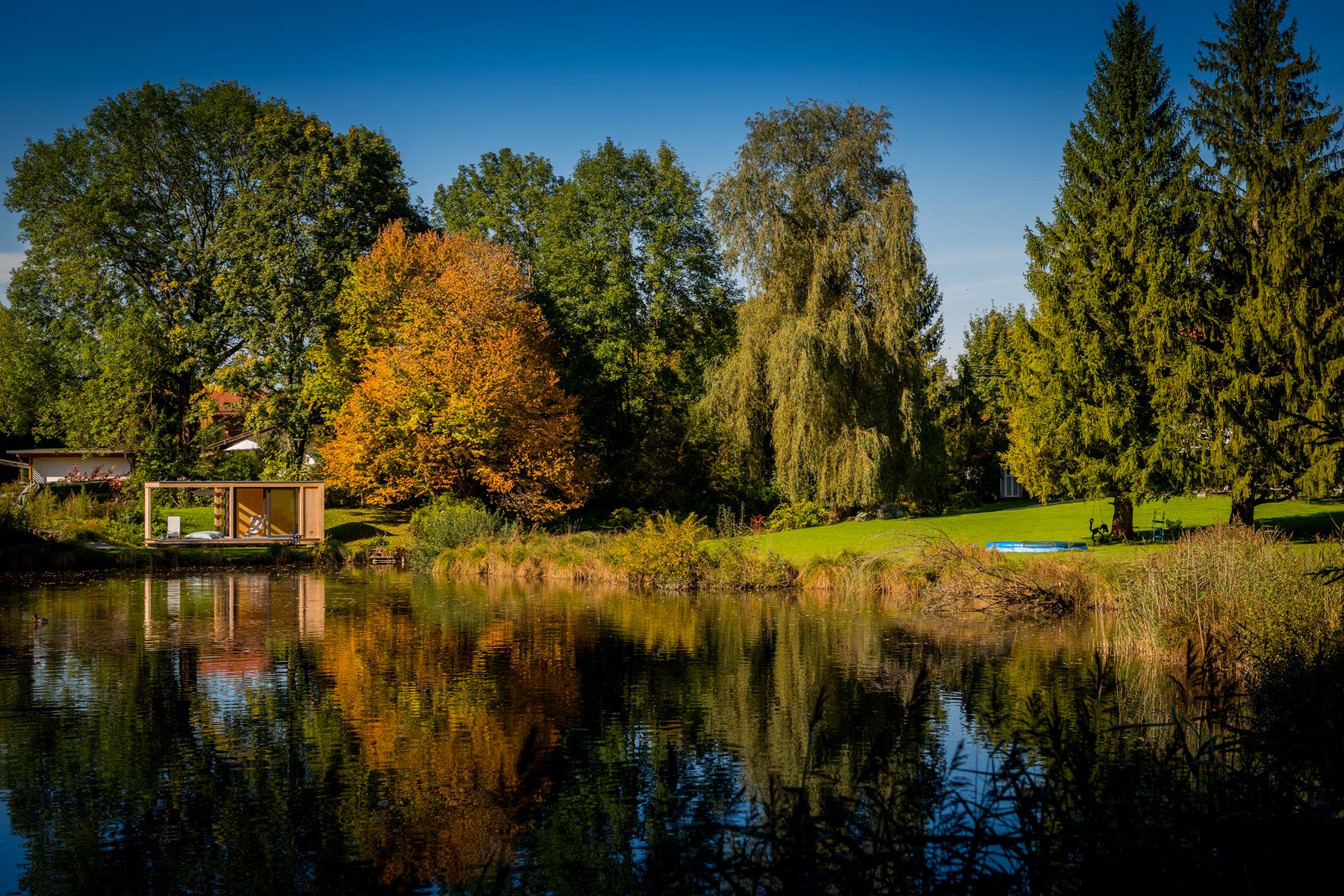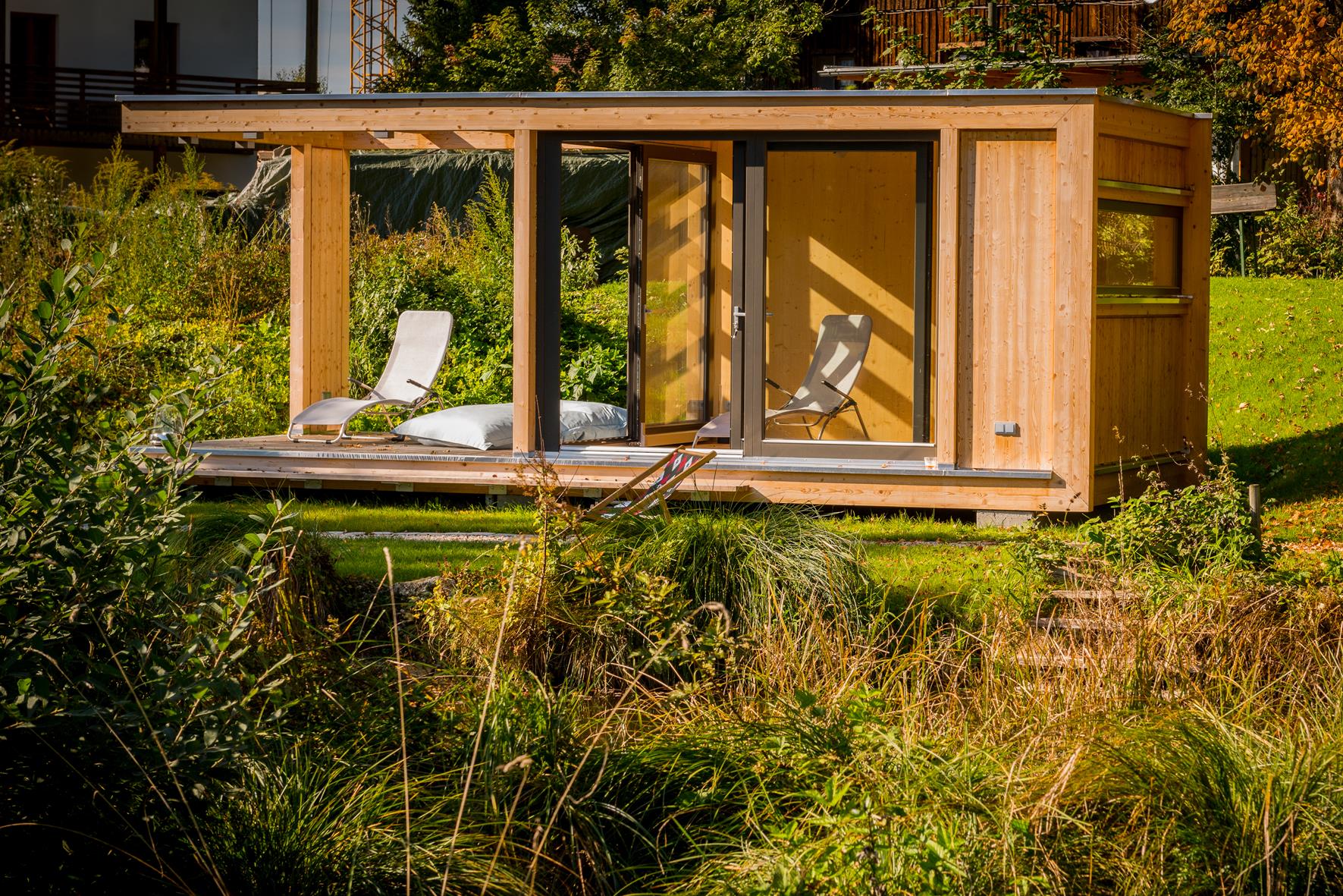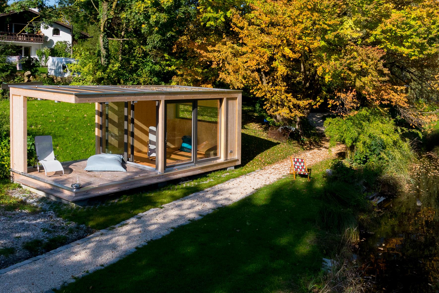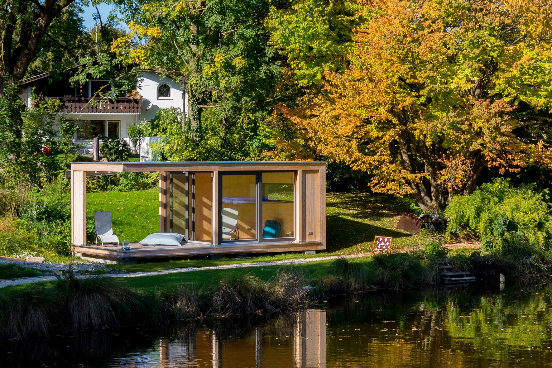 Dieses Gartenhaus wurde im kubischen "2.0-Design" mit den Grundabmessungen 3,5m x 7,5m erstellt. Als Teilbereich wurden davon 3m als offene Pergola ausgeführt - besonders gut kommt in diesem Bereich das freitragende Eckdetail zur geltung, welches ohne Stütze konstruiert werden konnte. In der Stirnseite wurde ein zusätzliches Lichband erstellt. Der Innenbereich ershließt sich zur Pergola hin über eine doppelte Schiebtüre. So ist jederzeit der Blick auf den idyllischen See frei - Urlaubsatmosphäre zu Hause!
