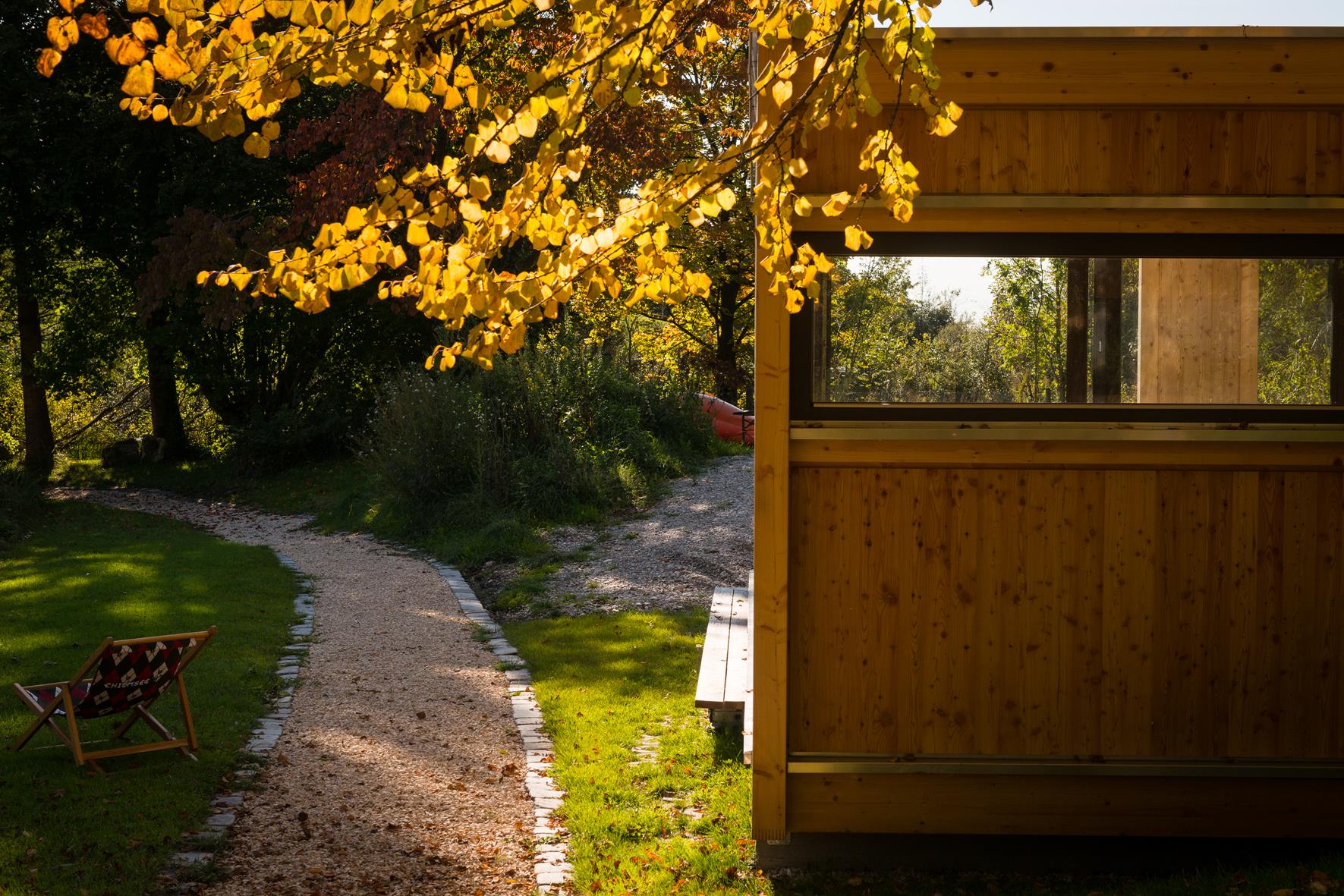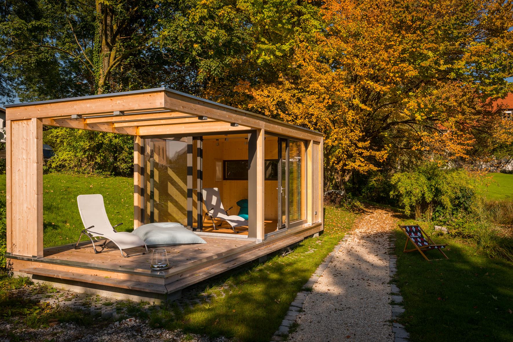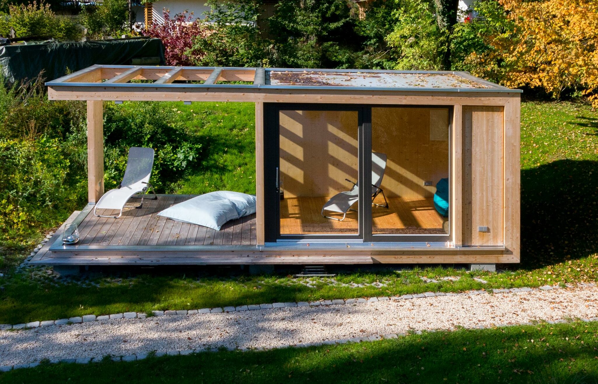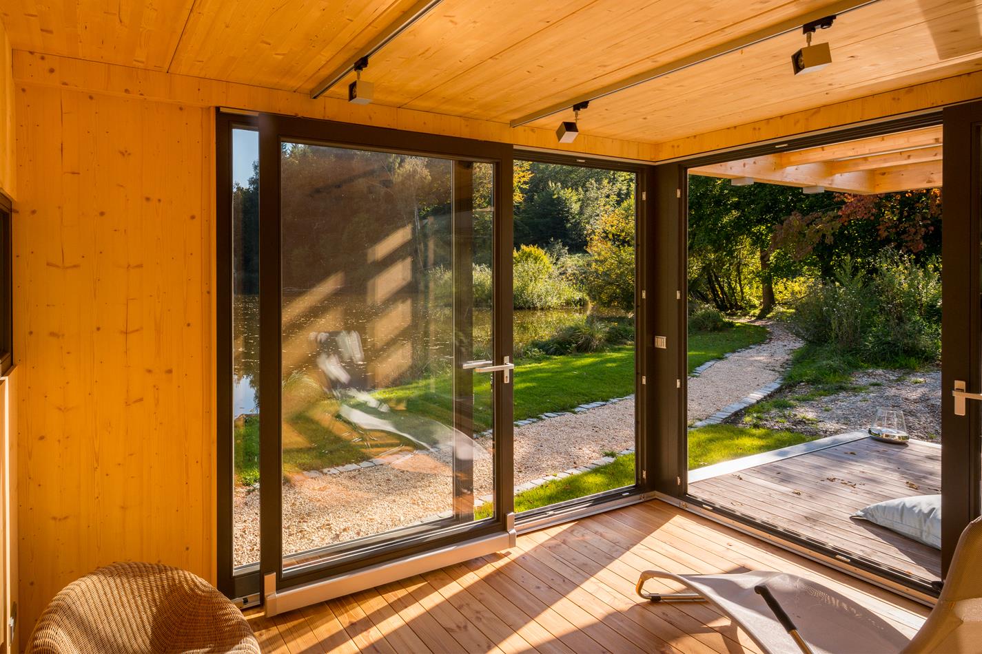 Dieses Gartenhaus wurde im kubischen "2.0-Design" mit den Grundabmessungen 3,5m x 7,5m erstellt. Als Teilbereich wurden davon 3m als offene Pergola ausgeführt - besonders gut kommt in diesem Bereich das freitragende Eckdetail zur geltung, welches ohne Stütze konstruiert werden konnte. In der Stirnseite wurde ein zusätzliches Lichband erstellt. Der Innenbereich ershließt sich zur Pergola hin über eine doppelte Schiebtüre. So ist jederzeit der Blick auf den idyllischen See frei - Urlaubsatmosphäre zu Hause!