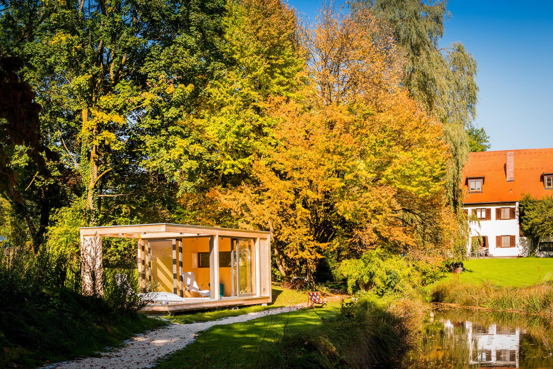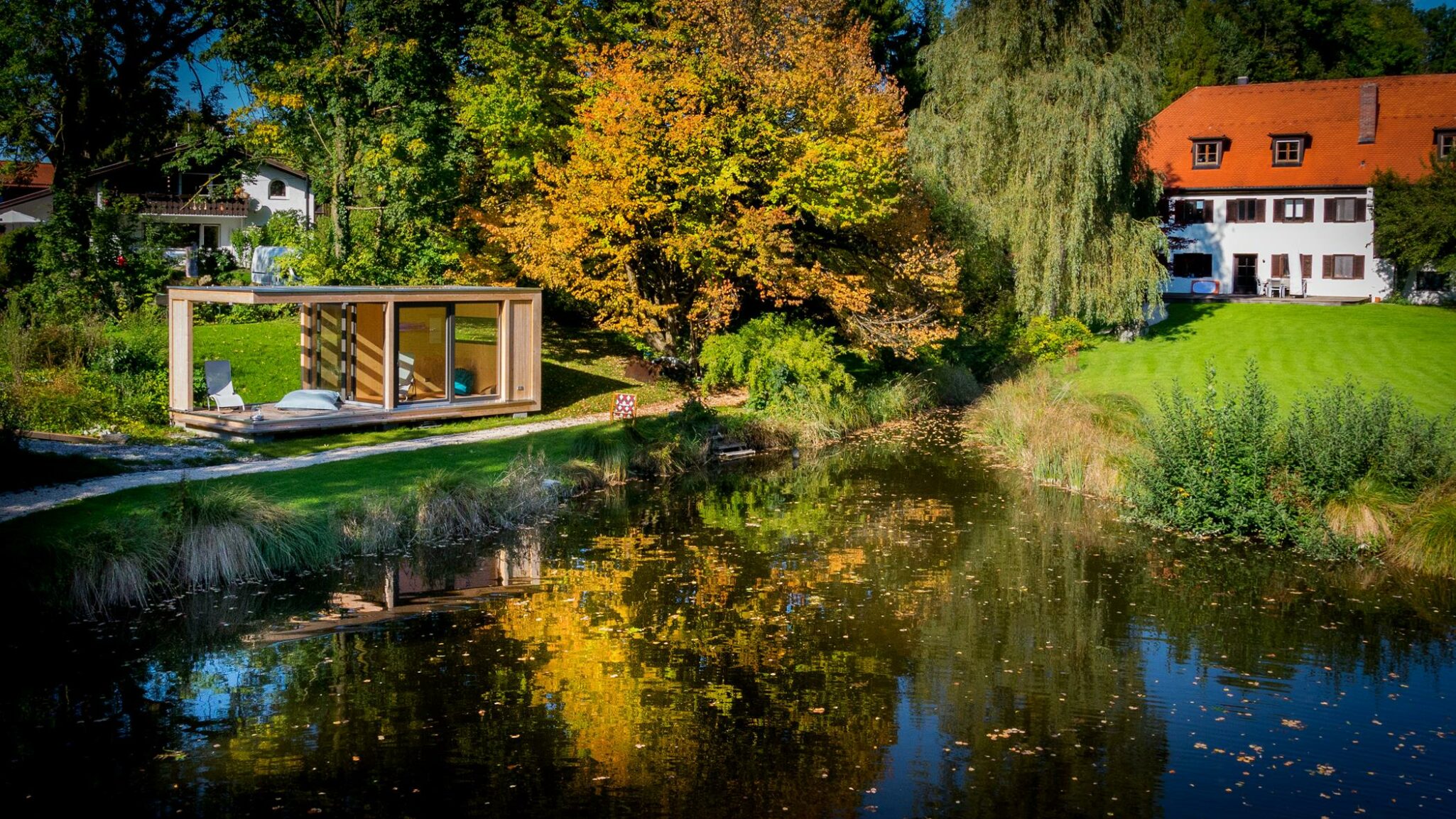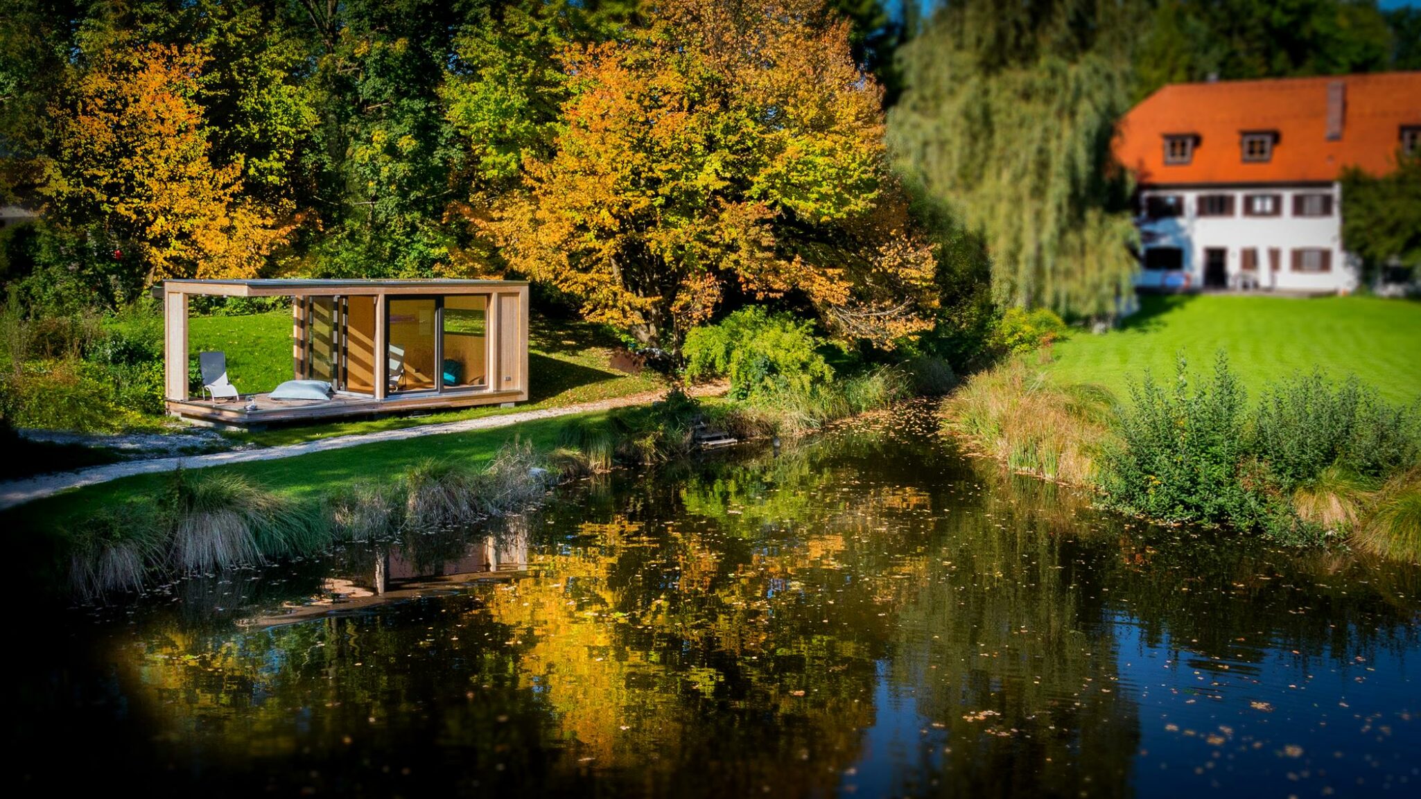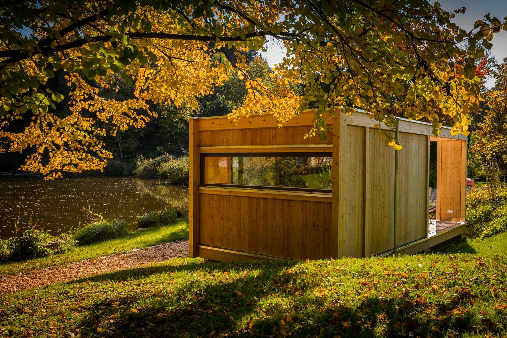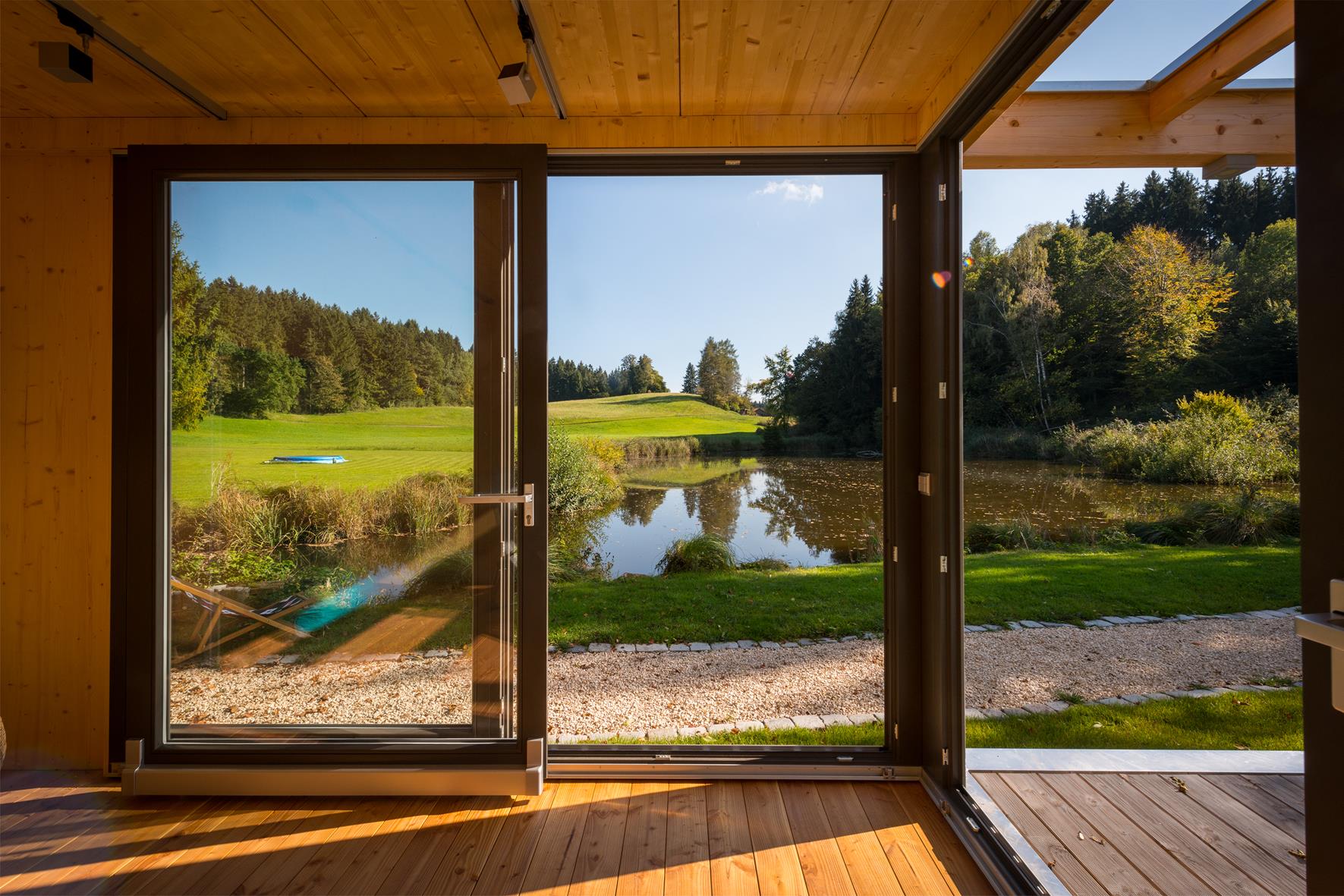 Dieses Gartenhaus wurde im kubischen "2.0-Design" mit den Grundabmessungen 3,5m x 7,5m erstellt. Als Teilbereich wurden davon 3m als offene Pergola ausgeführt - besonders gut kommt in diesem Bereich das freitragende Eckdetail zur geltung, welches ohne Stütze konstruiert werden konnte. In der Stirnseite wurde ein zusätzliches Lichband erstellt. Der Innenbereich ershließt sich zur Pergola hin über eine doppelte Schiebtüre. So ist jederzeit der Blick auf den idyllischen See frei - Urlaubsatmosphäre zu Hause!